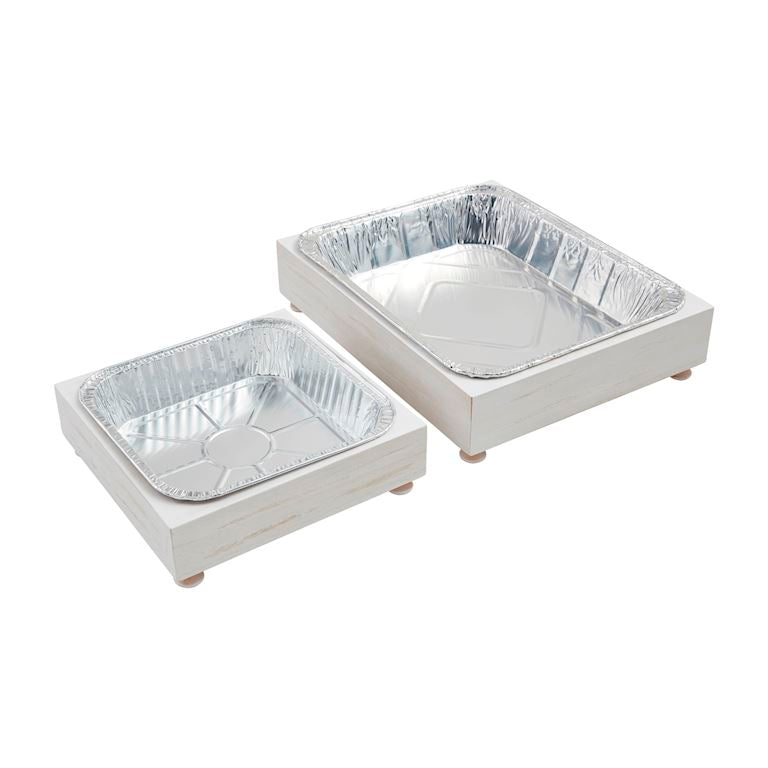 Whitewashed wood caddy holds 8"x 8" or 9 1/4" x 11 3/4" aluminum pans. Perfect for outdoor events.